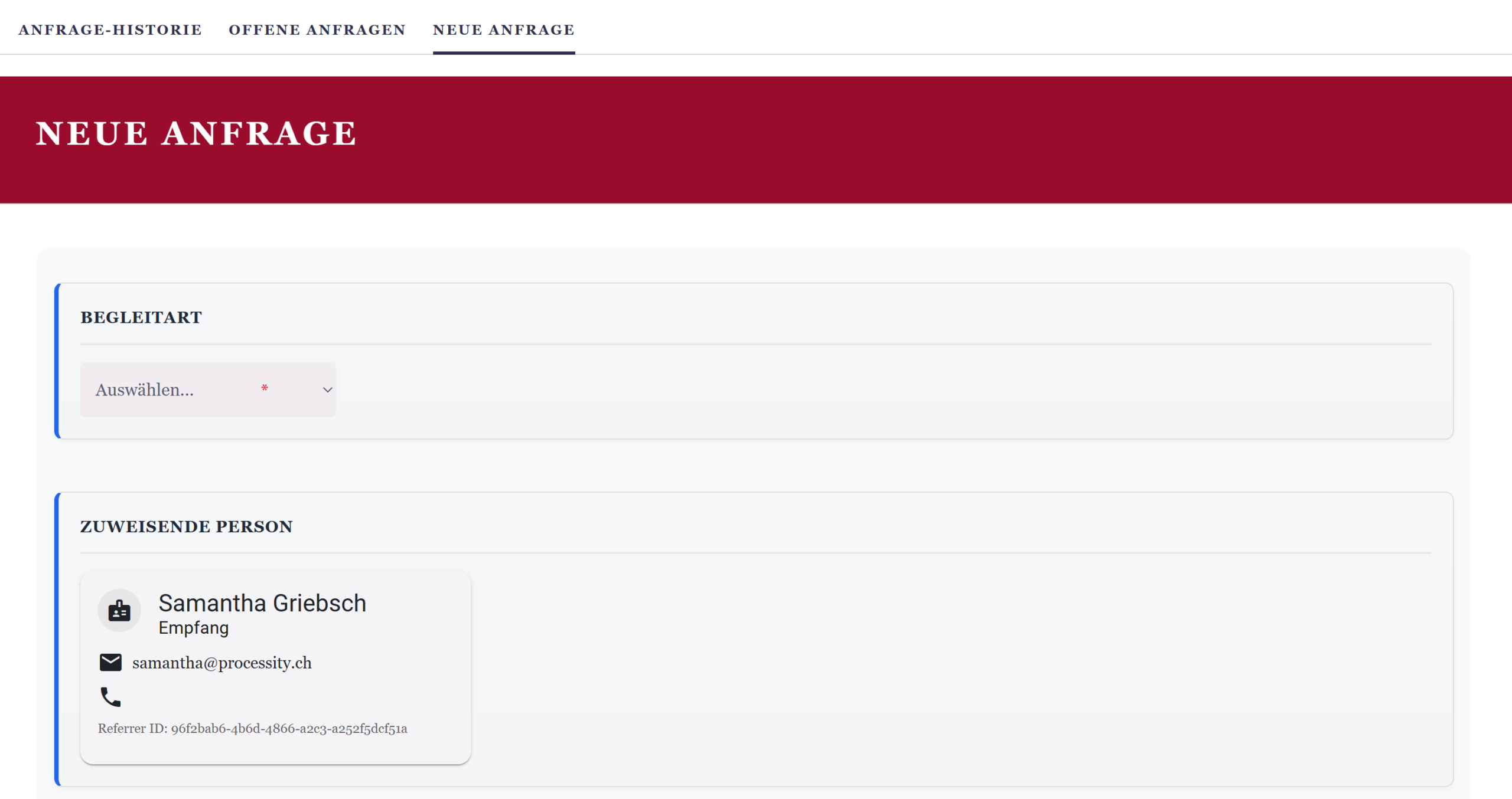 Zuweisende Stellen können bei der Anmeldung direkt gewünschte Begleitpersonen auswählen oder anhand von Profilen passenden Personen angeben. Diese «Personas» werden individuell erstellt und können Sprache, Alter, Geschlecht oder Einsatzgebiet umfassen. Mit diesen Angeboten wird ein perfektes Kundenerlebnis geschaffen.